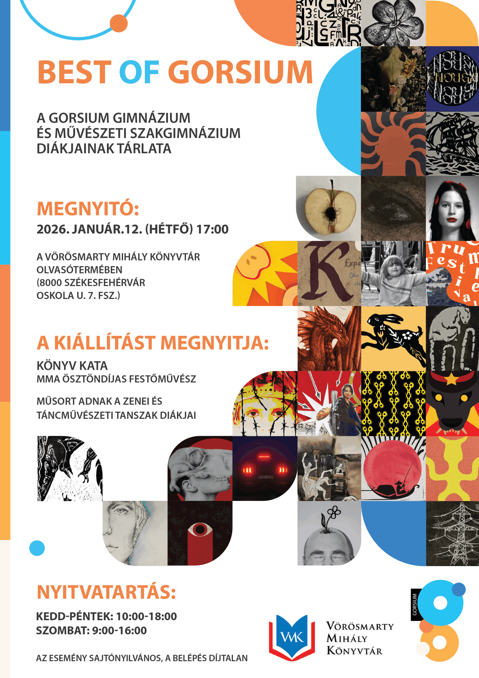 Gorsium Gimnázium és Művészeti Szakgimnázium diákjainak tárlatára, melynek megnyitója 2026.01.12-én 17:00 órakor lesz a székesfehérvári Vörösmarty Mihály Könyvtár olvasótermében